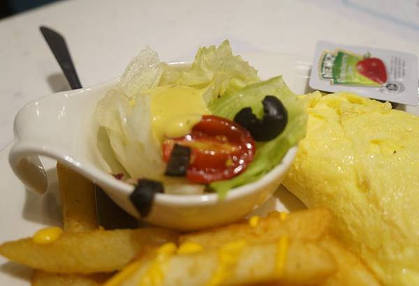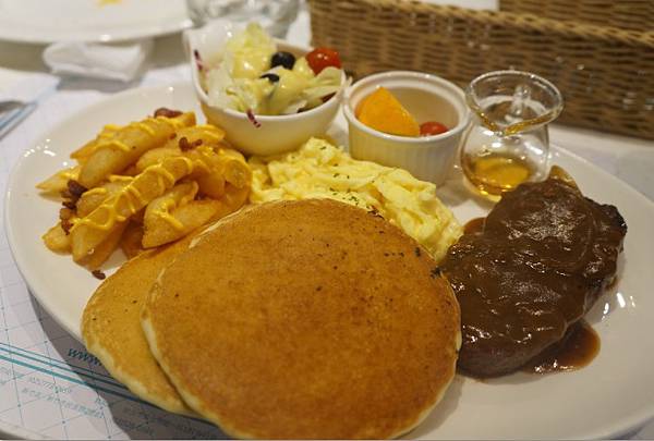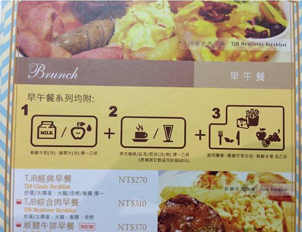 包含 牛奶/蘋果汁 +飲料(咖啡紅茶擇一,選其他飲品折60元)+主餐+薯條+沙拉+水果